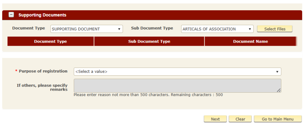 Then, select the reason for registration (example: “Tax Purposes”).